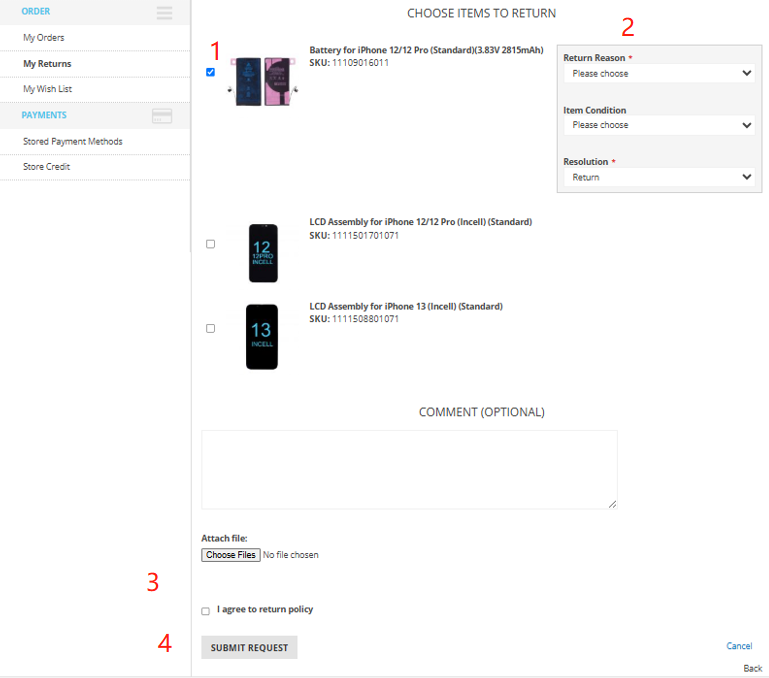 - Check the box for the item you want to return