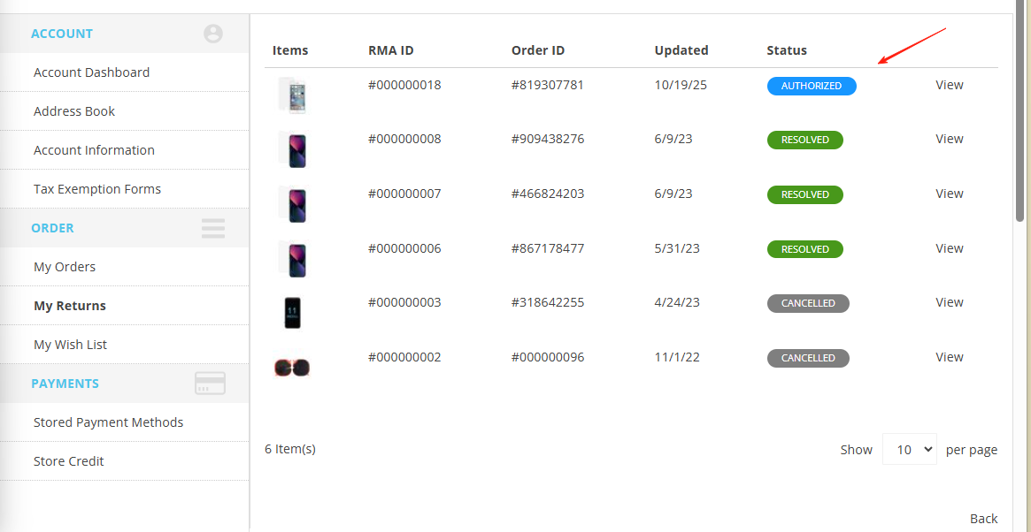 - Go back to your returns account. Allow 2 – 4 business days for us to process your return request. Once the return is approved, you will see the status changed to "AUTHORIZED"